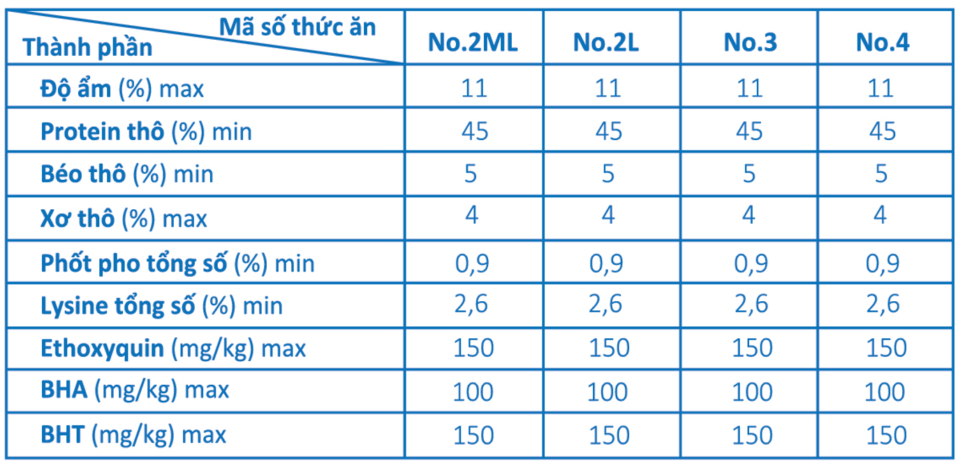 • Hàm lượng protein tối thiểu đạt 45% với đầy đủ 10 loại axít amin thiết yếu cho tôm.